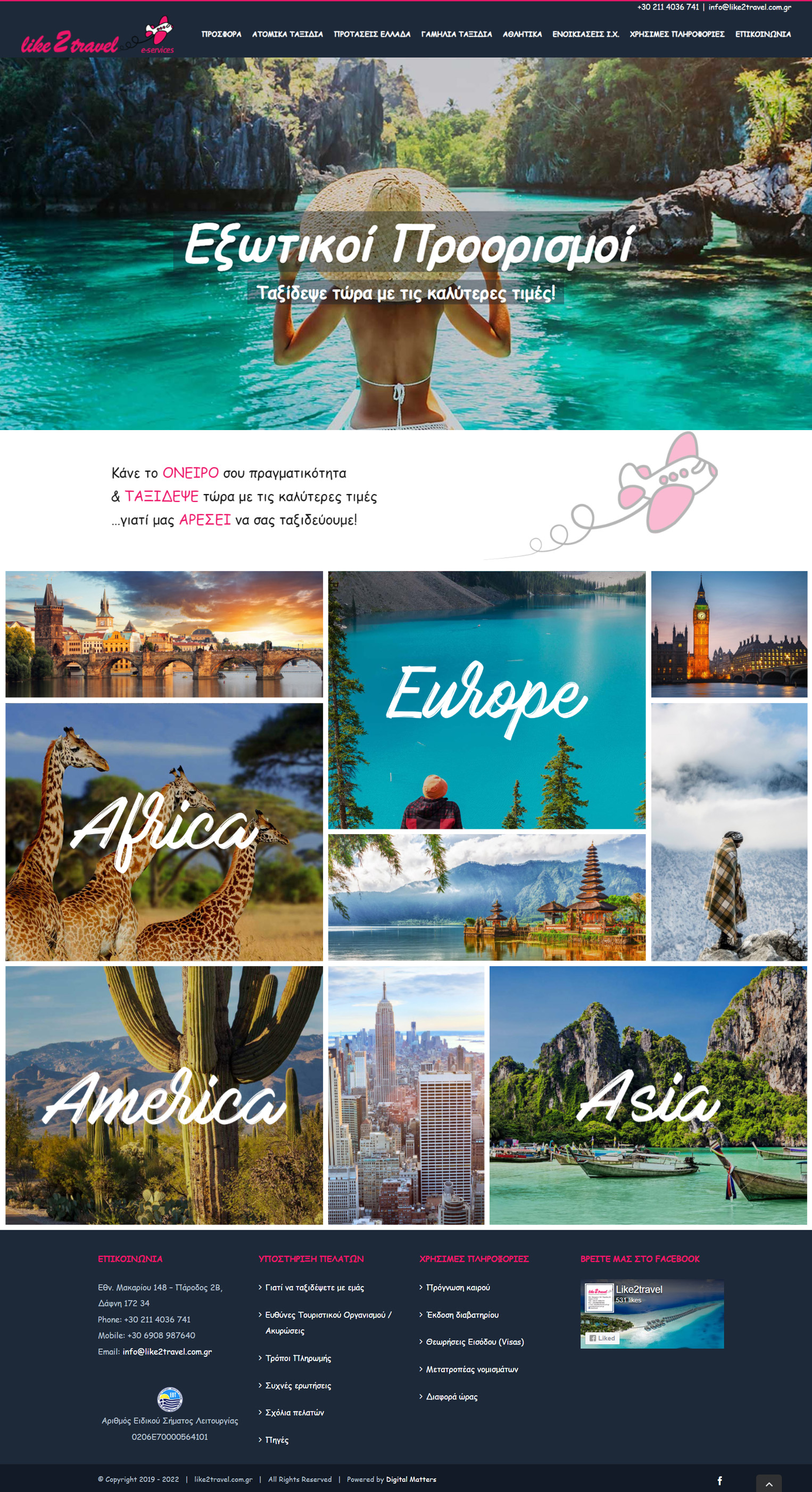 Ο ταξιδιωτικός οργανισμός Like2Travel e-services ιδρύθηκε με σκοπό να προσφέρει ηλεκτρονικές ταξιδιωτικές και τουριστικές υπηρεσίες με αξιοπιστία, υπευθυνότητα και σε εξαιρετικά χαμηλές τιμές για όλο τον κόσμο.